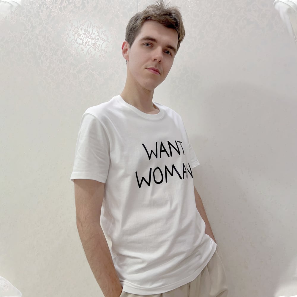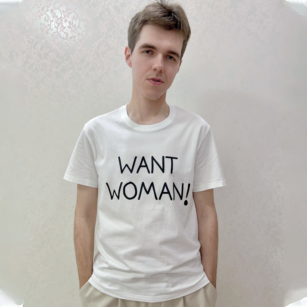 Cotton T-shirt with printed WANT WOMAN! phrase as written on a white sports bra worn by Christine (née Christian) Weston Chandler, aka Chris Chan at a "Fridays After Five" outdoor event in Charlottesville, Virginia, on July 9, 2010.