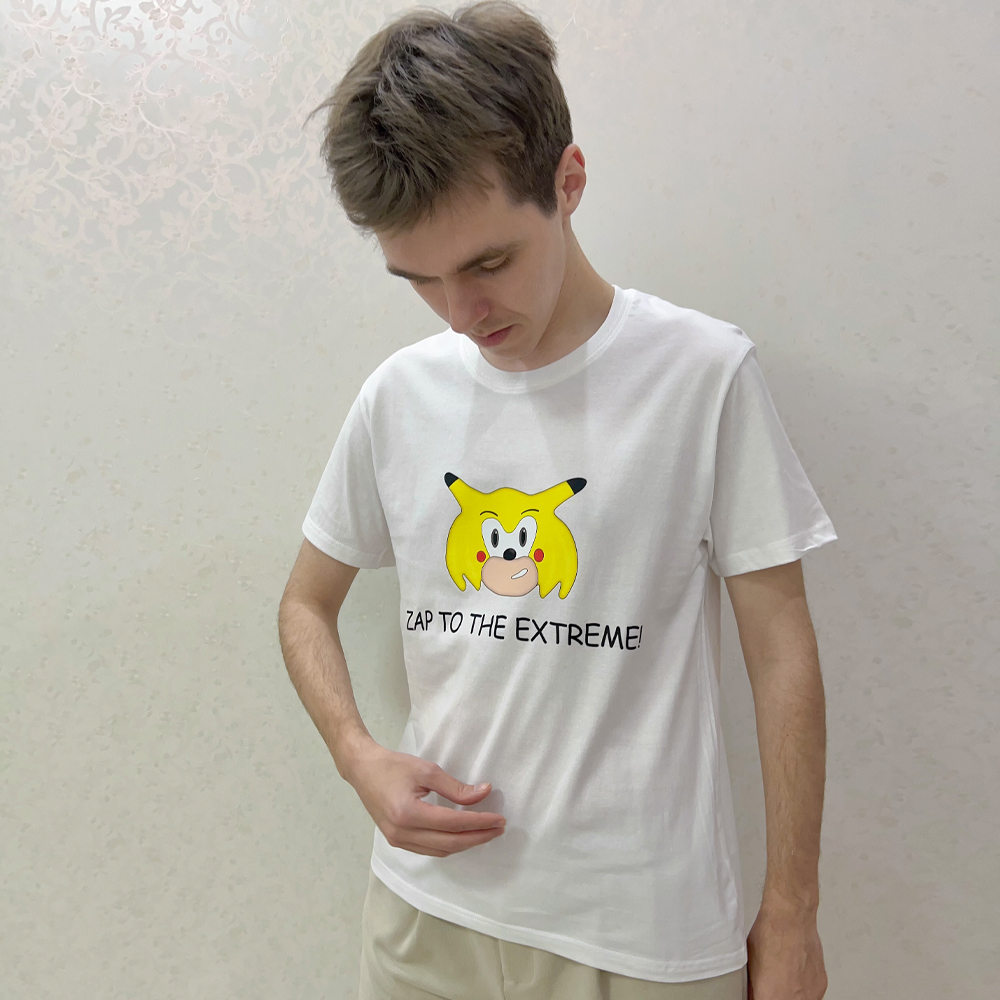Cotton T-shirt with printed Sonichu Electric Hedgehog and catch-phrase "Zap to the Extreme!"as written by Christine (née Christian) Weston Chandler, aka Chris Chan.