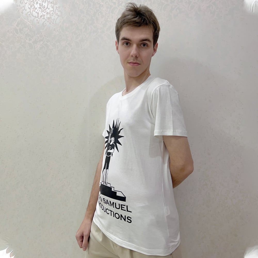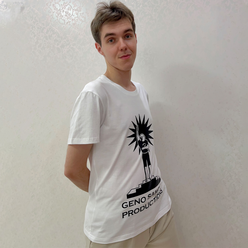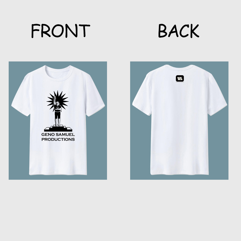 Cotton T-shirt with printed Geno Samuel Productions logo featuring Geno Samuel mascot Dirk Simbach in a pose parodying the Columbia Pictures logo, as seen in the intro of the GenoSamuel3 YouTube video North Sentinel Island: A Private Paradise.
